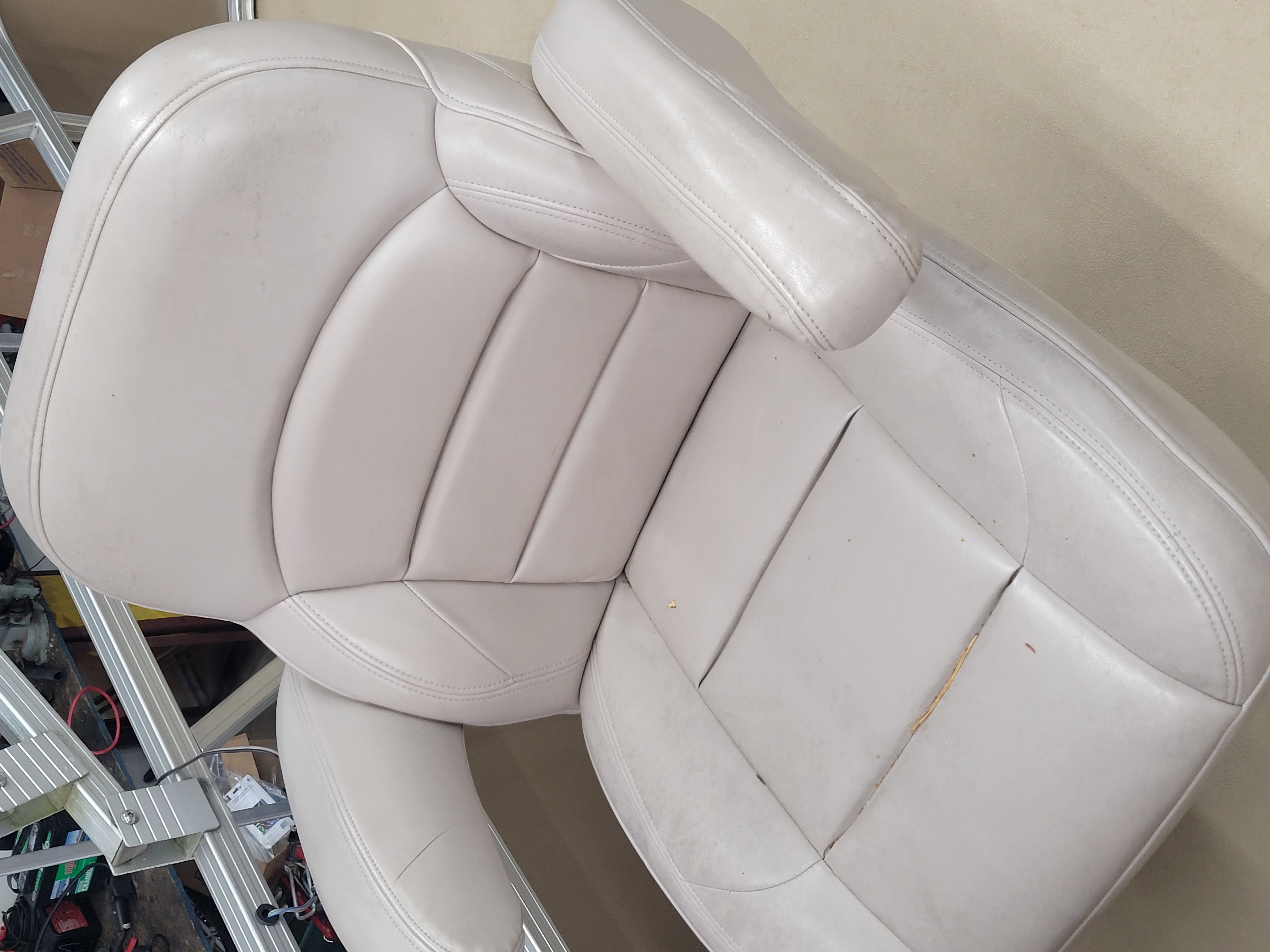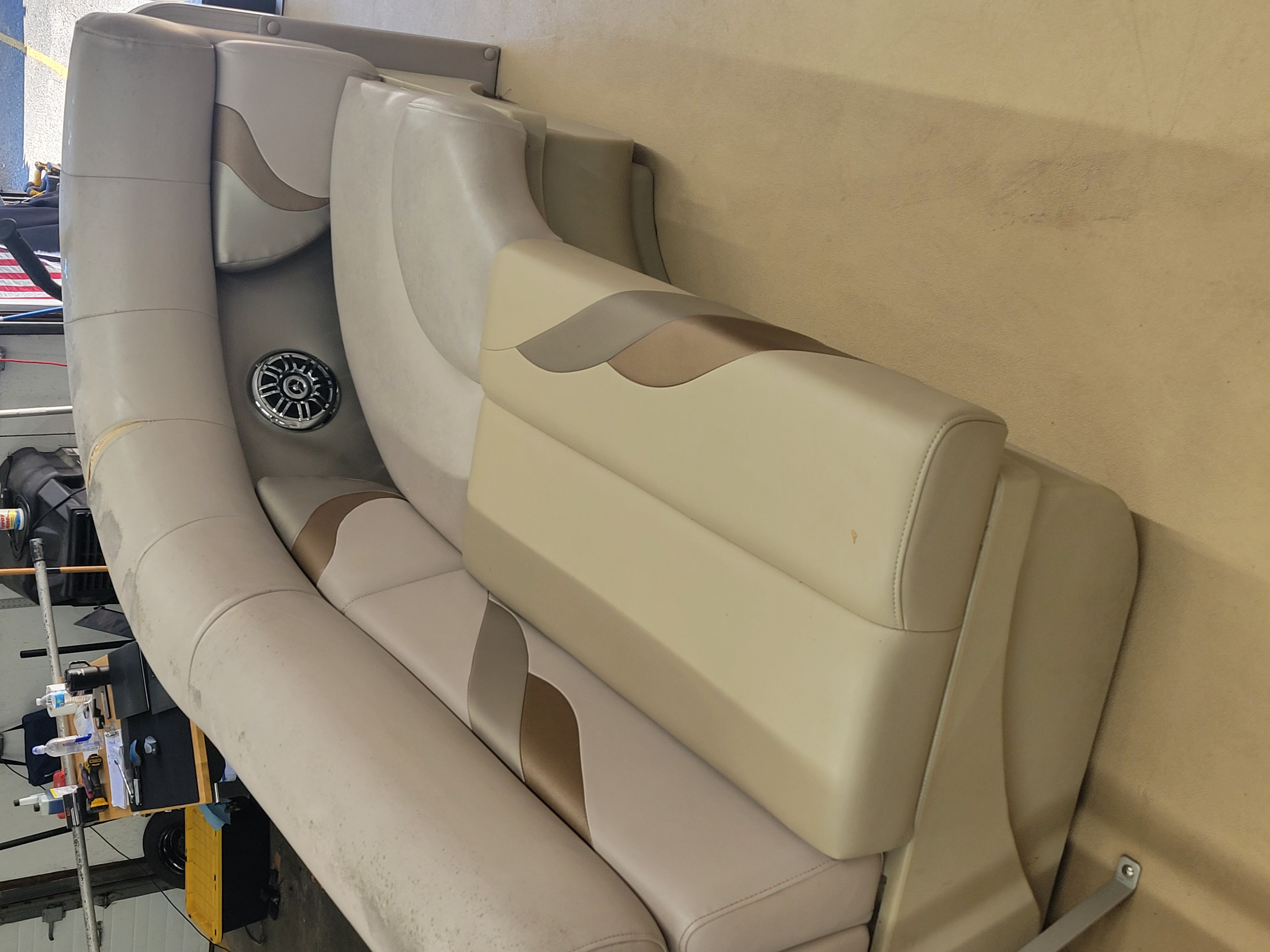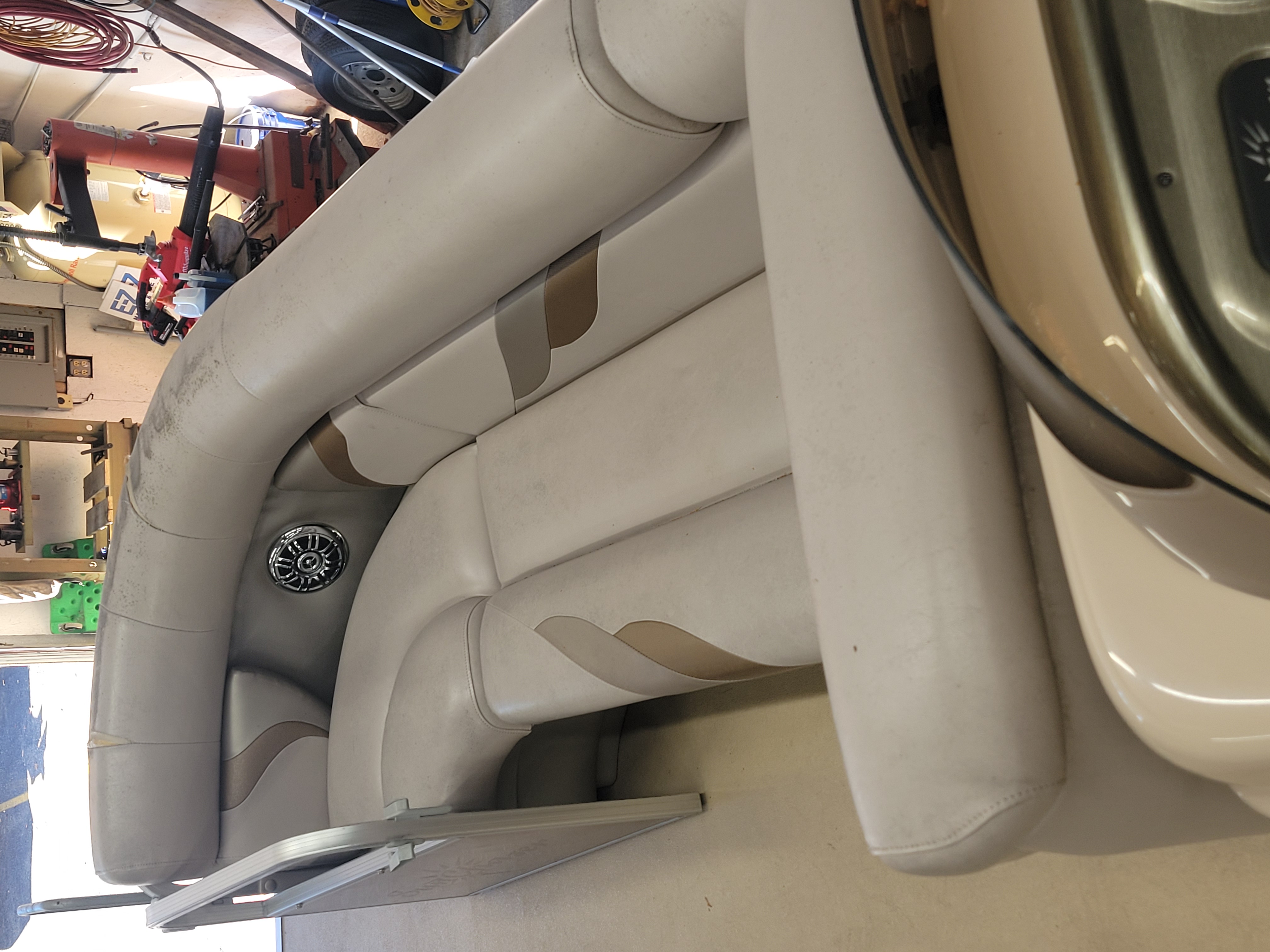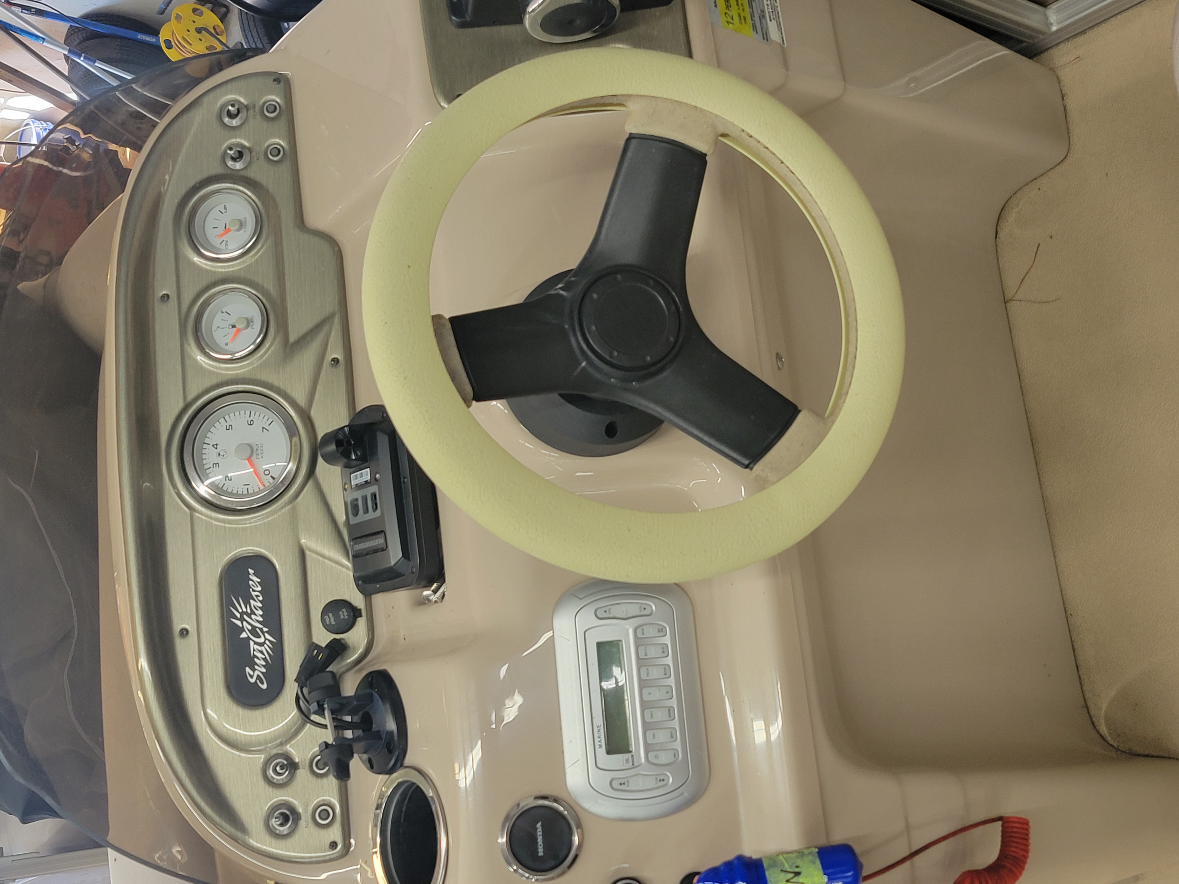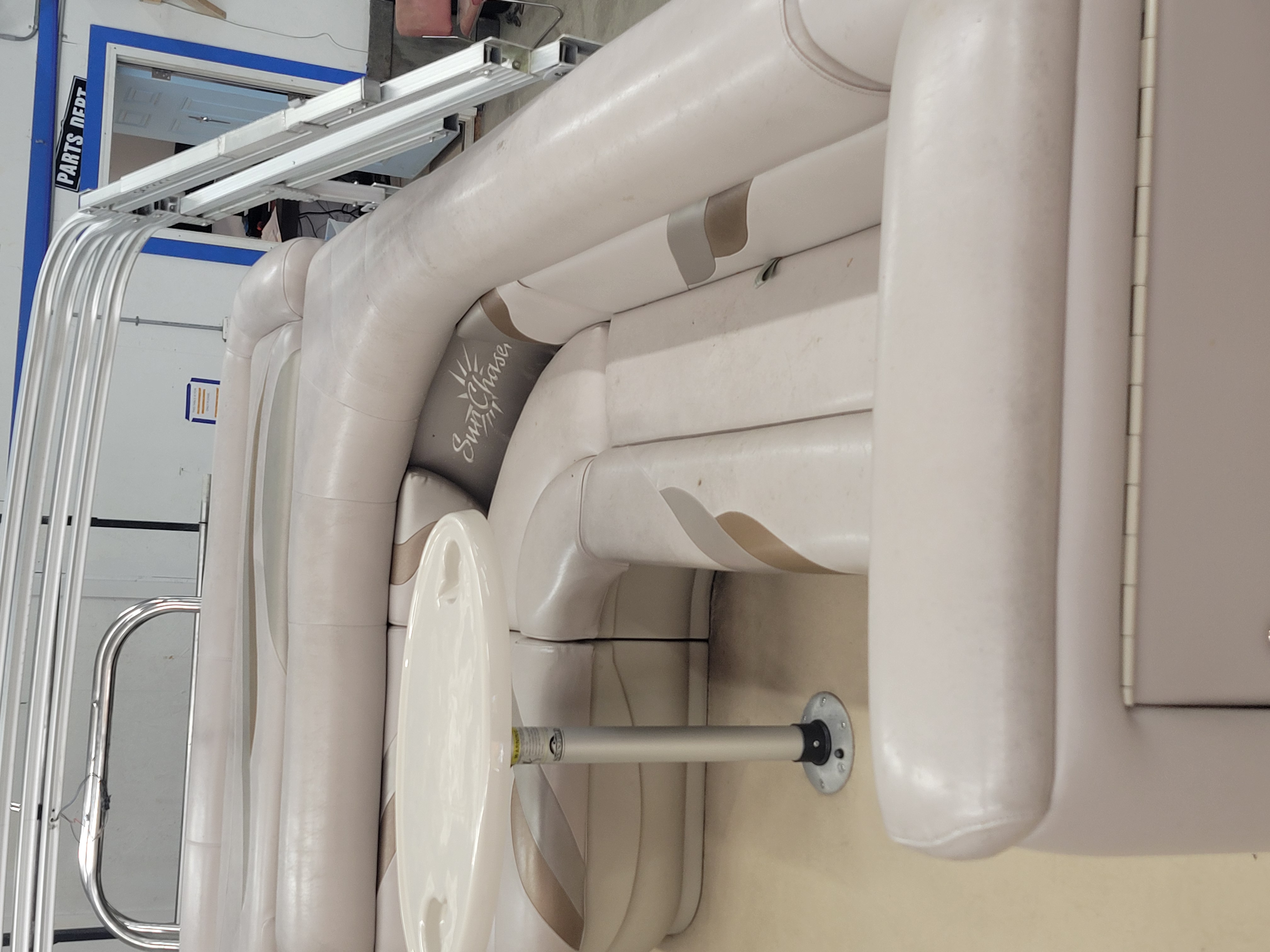 Standard features include a fiberglass console with a windscreen and cooler storage, tachometer and fuel gauges, an AM/FM stereo, specific furniture and helm chair, a color-coordinated bimini top, a removable table, rear entry with a ladder, a changing room, and carpet.