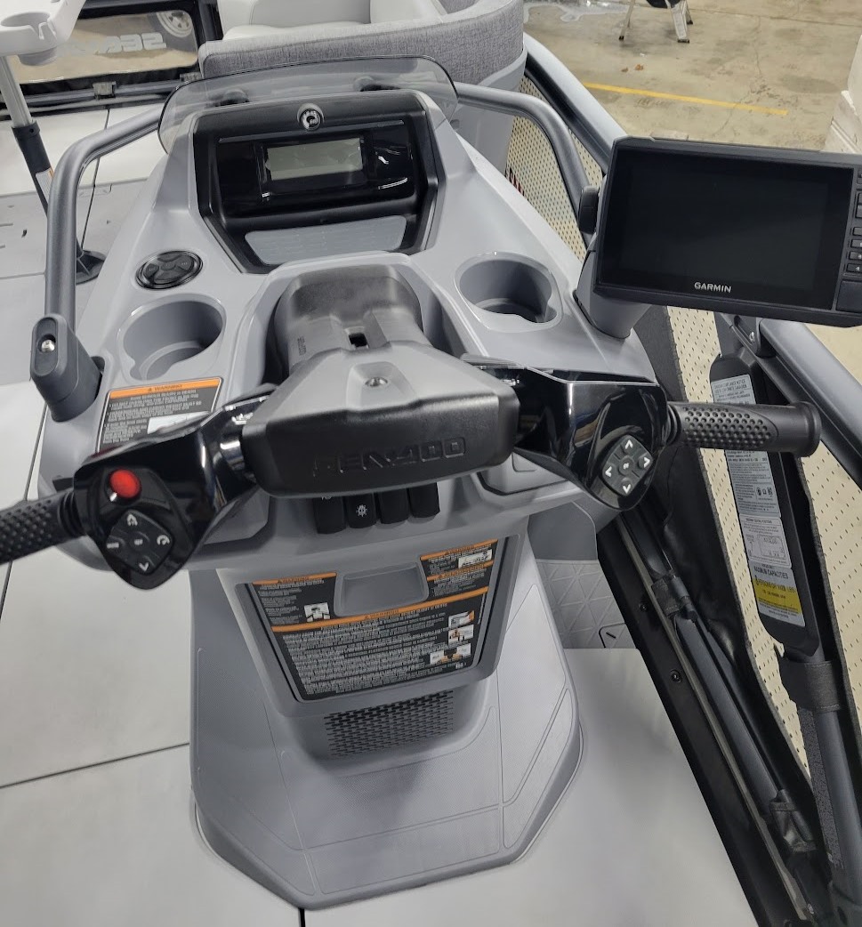 The "2023 switch sport 18-i/o" refers to the 2023 Sea-Doo Switch Sport 18-i/o, an 18-foot pontoon boat model designed for water sports. It is powered by a 230 horsepower Rotax 1630 ACE engine and features the Intelligent Brake & Reverse (iBR) system for braking and reverse. Key features include a customizable interior, 7-person capacity, a BRP Audio System, a Garmin 7-inch GPS, and a Polytecâ„¢ Tri-Hull.